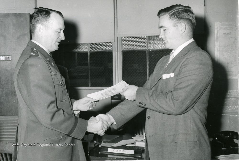 - 'William Carr, son of Mr. and Mrs. Ralph A. Carr of Mannington and the husband of the former Miss Sheila Dian Bierer of Morgantown, is congratulated by Colonel A. H. Davidson, Jr., Director of the U. S. Army Engineer Research and Development Laboratories, Fort Belvoir, Virginia, upon receiving an 'Outstanding' work performance rating.' 'Technical Liaison Office, U.S. Army Engineer Research and Development Laboratories.'