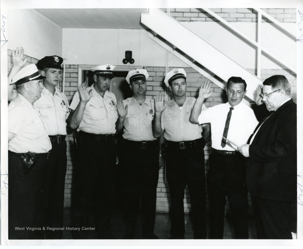 - City Policemen taking oath. (right to left): James Ashburn, Robert West, George Ratchur, Bennie Palmer, Bill Hughes, William Musgrave, and Chief John Lewis.
