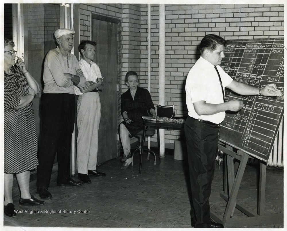 - Dorthy Hiner, seated; Rex Everly, white shirt, standing; and Harold Wildman, wearing hat, standing; watch as votes are recorded on a chalk board.