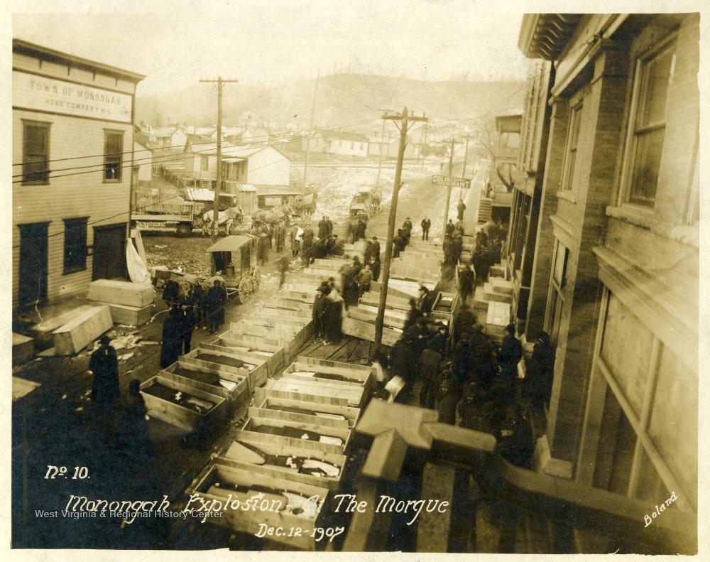 - Caskets line the street which served as a makeshift morgue for the miners killed in the explosion at the Fairmont Coal Company Monongah Mines. Note: image is taken from the original print donated to the West Virginia Collection.
