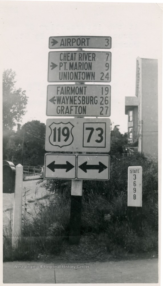 - Highway signs to the airport, Cheat River, Point Marion, Uniontown, Fairmont, Waynesburg, and Grafton at the Intersection of Spruce St. and Willey St., Morgantown, W. Va.