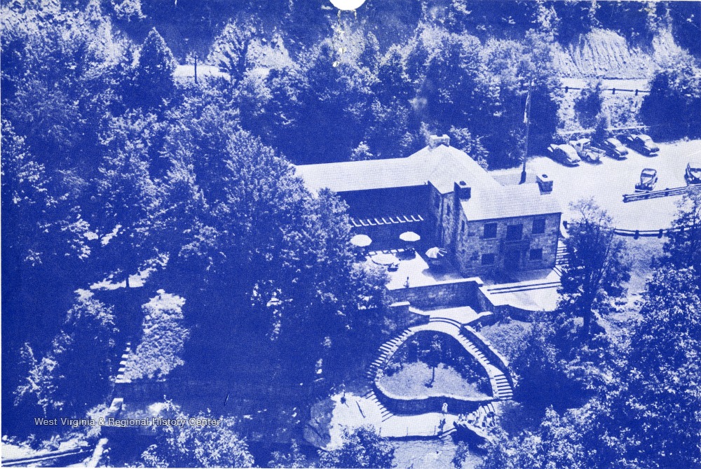- Aerial view of the Administration Building and parking area at Babcock State Park in Fayette County, W. Va.