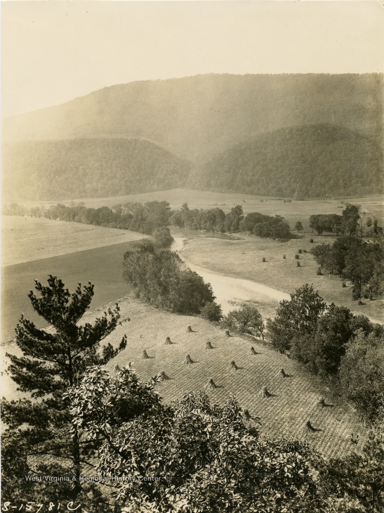 - View of harvested fields and a tree-lined river running through the center of this scene in Hampshire County. Tree-covered mountains are seen in the distance.