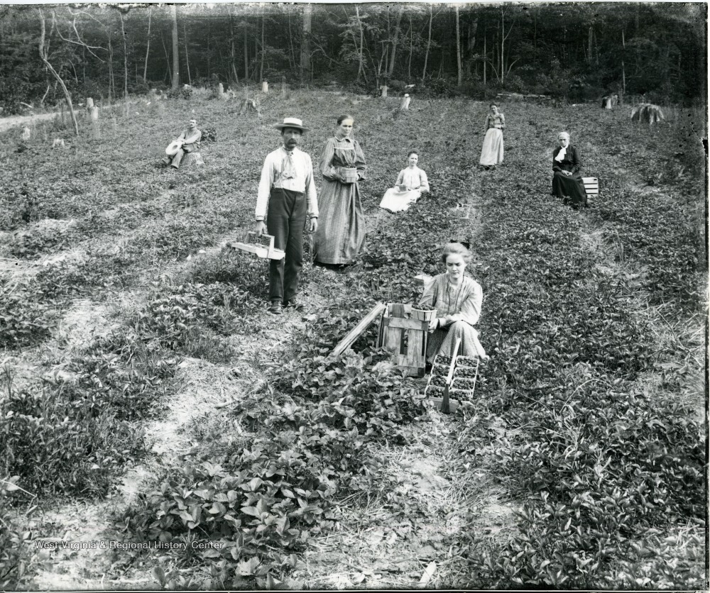 - View of men and women picking strawberries in a field in Greenbrier county.