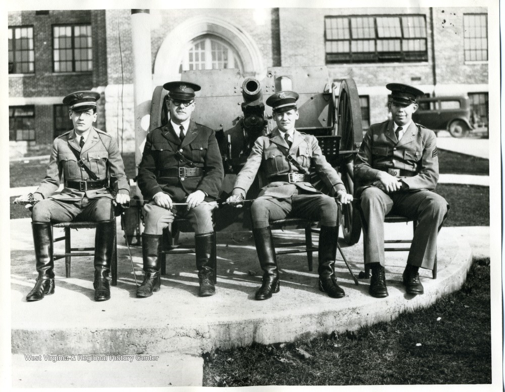 - Group portrait of uniformed men with sabers drawn pose in front of Greenbrier Military School.