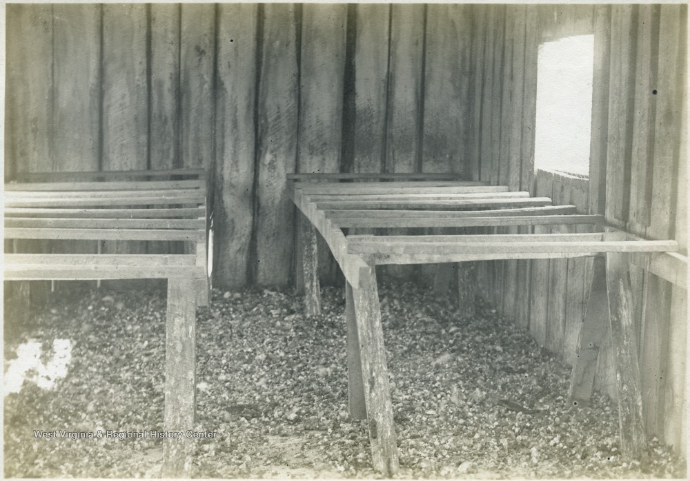 - 'Interior of Mr. C. E. Crow's poultry house. The perches are well arranged, the ventilation is fair, the house is well constructed, but the value of the poultry manure as a fertilizer is not considered. This is a general condition in certain parts of the county.' From photo album labeled 'Stewart A. Cody, County Agent, Jackson County, 1912.'