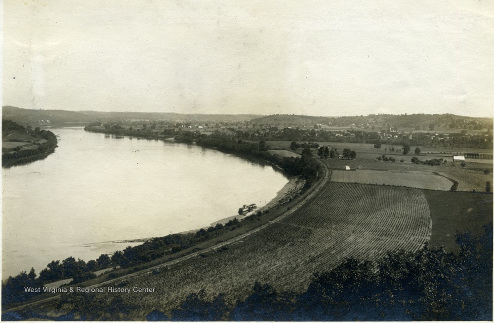 - 'The Ohio River, showing the town of Ravenwood and the bottom land of the West Virginia side. This bottom land is most noticeable from Muses bottom to the Schoolhouse.' From photo album labeled 'Stewart A. Cody, County Agent, Jackson County, 1912.'