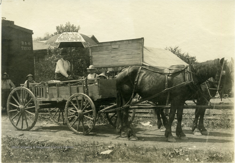 - 'A Country merchant with a load of poultry and eggs hauled several miles in the hot sun over rough country roads.' From photo album labeled, 'Stewart A. Cody, County Agent, Jackson County, 1912.' Wording on umbrella says 'H. E. Beegle Wholesale Shipper of Country Produce, Ravenswood, W. Va.'