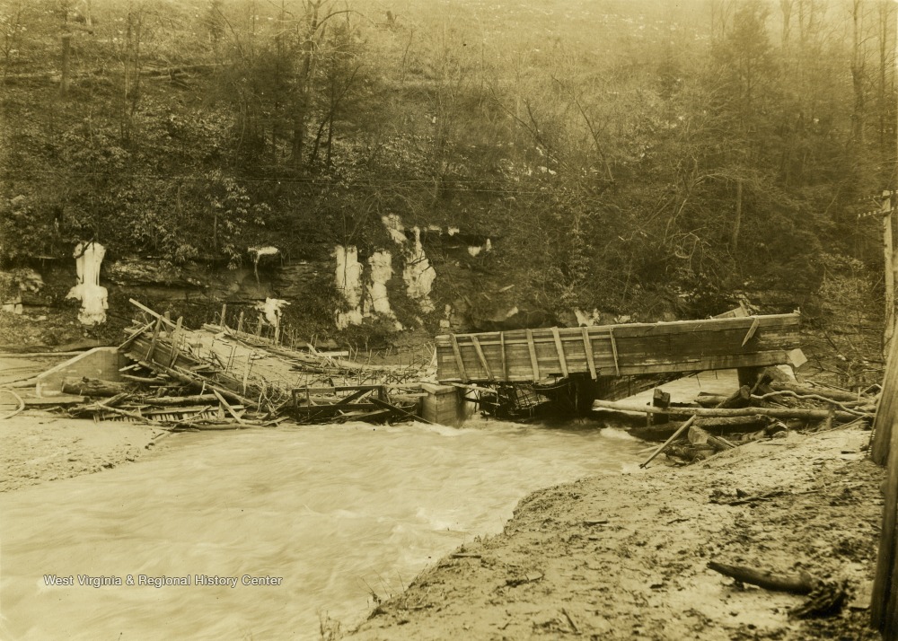 - A view of the remains of a bridge in Logan County, 'dynamited by thoughtless people during a flood.'
