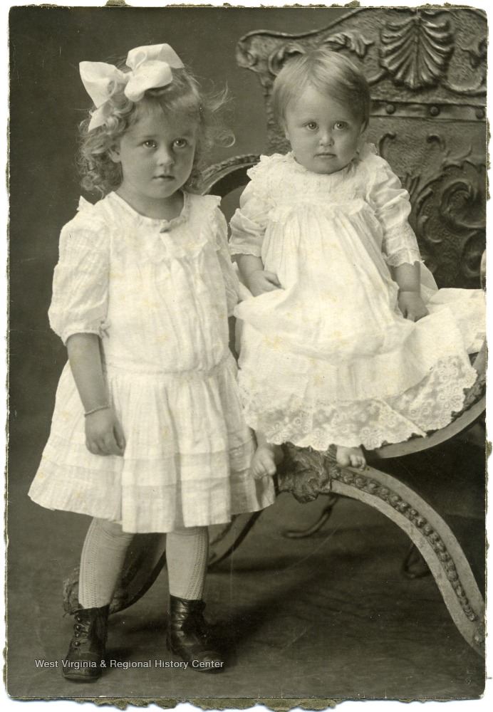 - Portrait of Maggie and Helen Ballard in white dresses.