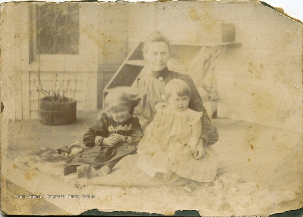 - May Ballard sits on a porch with her two daughters, Maggie and Helen.
