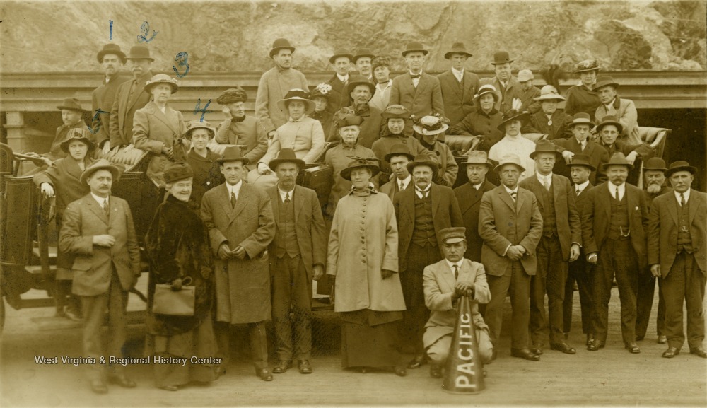 - A group portrait taken in San Francisco, California. 'In the group on the left- 1, Isaac Ballard; 2, Chas. Lingo; 3, May Ballard; 4, Maggie Ballard; 5, Helen Ballard.'
