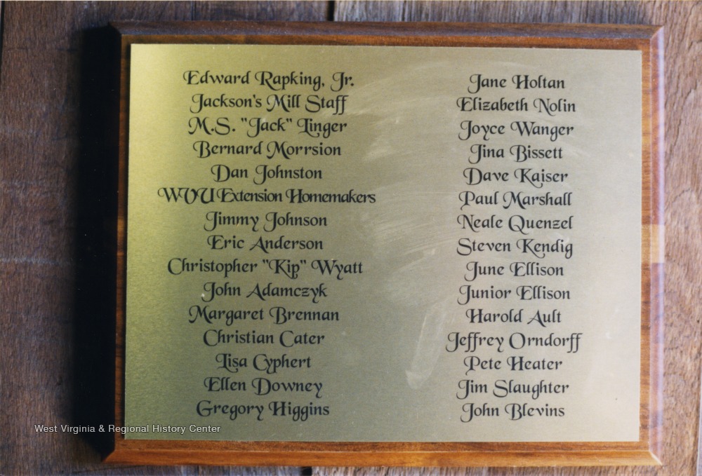 - A view of a plaque commemorating those who have supported the preservation of the old mill. Plaque is likely inside Blaker's Mill, a Greenbrier County mill relocated to Jackson's Mill.