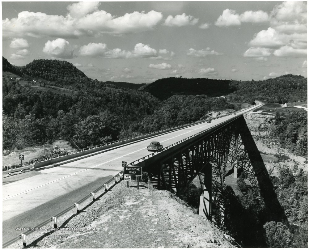 - The Charlton Memorial Bridge towers 246 feet over the Bluestone Gorge. This photo was copyrighted in 1955 by Harlow Warren of Beckley.