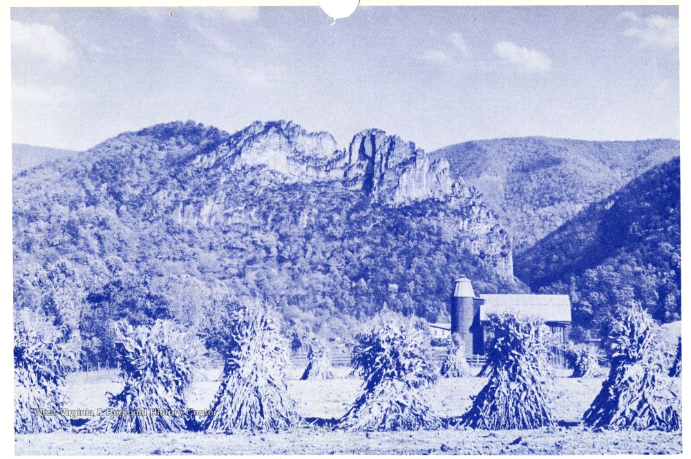 - 'A typical West Virginia farm scene with majestic Seneca Rock in the back-ground. Located on U.S. Route No. 33 in Pendleton County. Emmett Carmichael, Agent, Wellsburg, W.Va.'