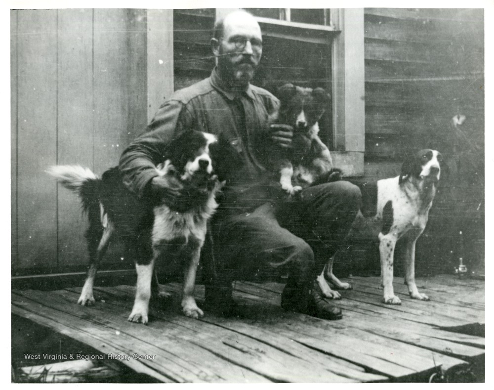 - A portrait of Adam T. Dodrill and three dogs on a porch in Webster County, West Virginia.