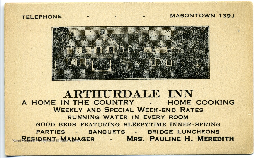 Arthurdale Inn Advertisement, Masontown, Preston County, W. Va.