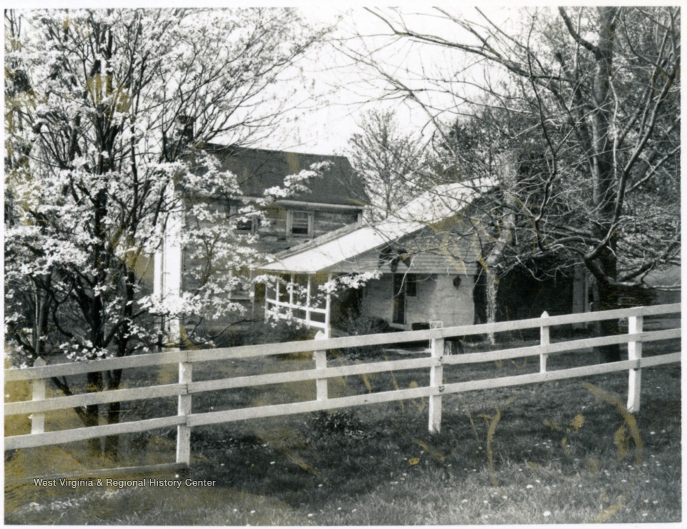 - 'Cabins of pioneer settler Thomas Lazzle as they appeared in 1976. The building in the foreground is said to have been constructed in the 1770's, the other about 1790.' From the Monongalia Story, vol. 2, by Earl Core.