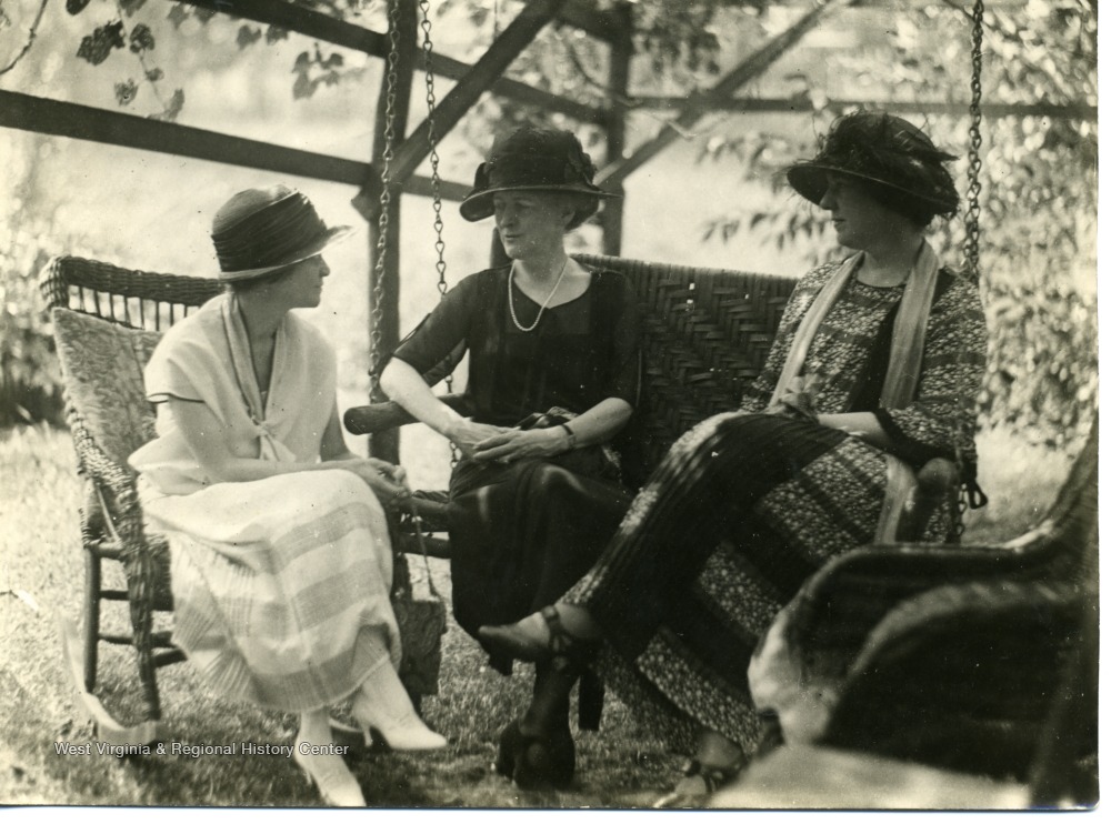 - On Davis porch or yard in vineyard. Left to right- Mrs. James Jackson, Mrs. John W. Davis, and unidentified.