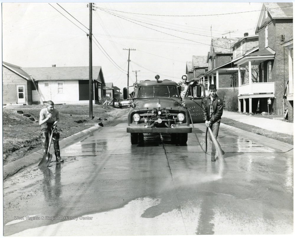 - Fire Department Workers Using Fire Hoses to Clear a Road, Star City, W.Va.