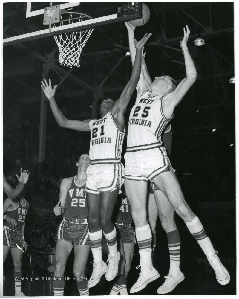 - WVU Basketball Players Ron Williams (21) and Bob Benfield (25) Rebounding vs. Virginia Military Institute