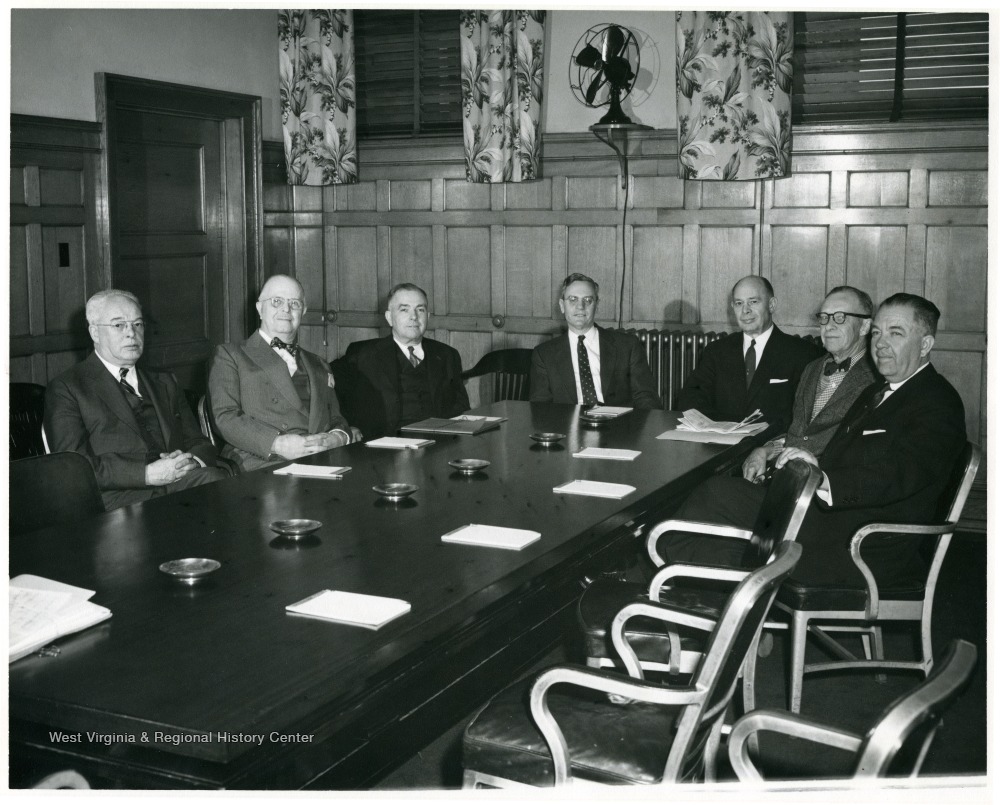- Picture was taken in the Board of Governors Room in Stewart Hall. 'Left to right: 1. Mr. A.C. Spurr, 2. Dr. Thomas L. Harris, 3. Mr. James M. Guiher, 4. Dr. Irvin Stewart, 5. Mr. Douglas K. Bowers, 6. Mr. Charles Hodges, 7. Governor Okey L. Patteson.'