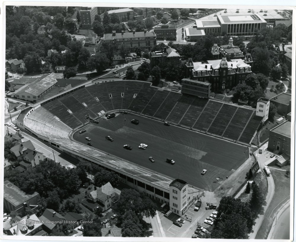 - Aerial View of Installation of Astro Turf on Mountaineer Field, West Virginia University