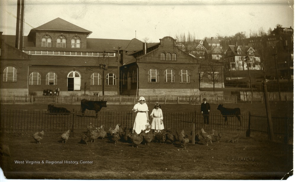 Israel C. White Family Feeding Chickens behind Mechanical Hall II, West Virginia University