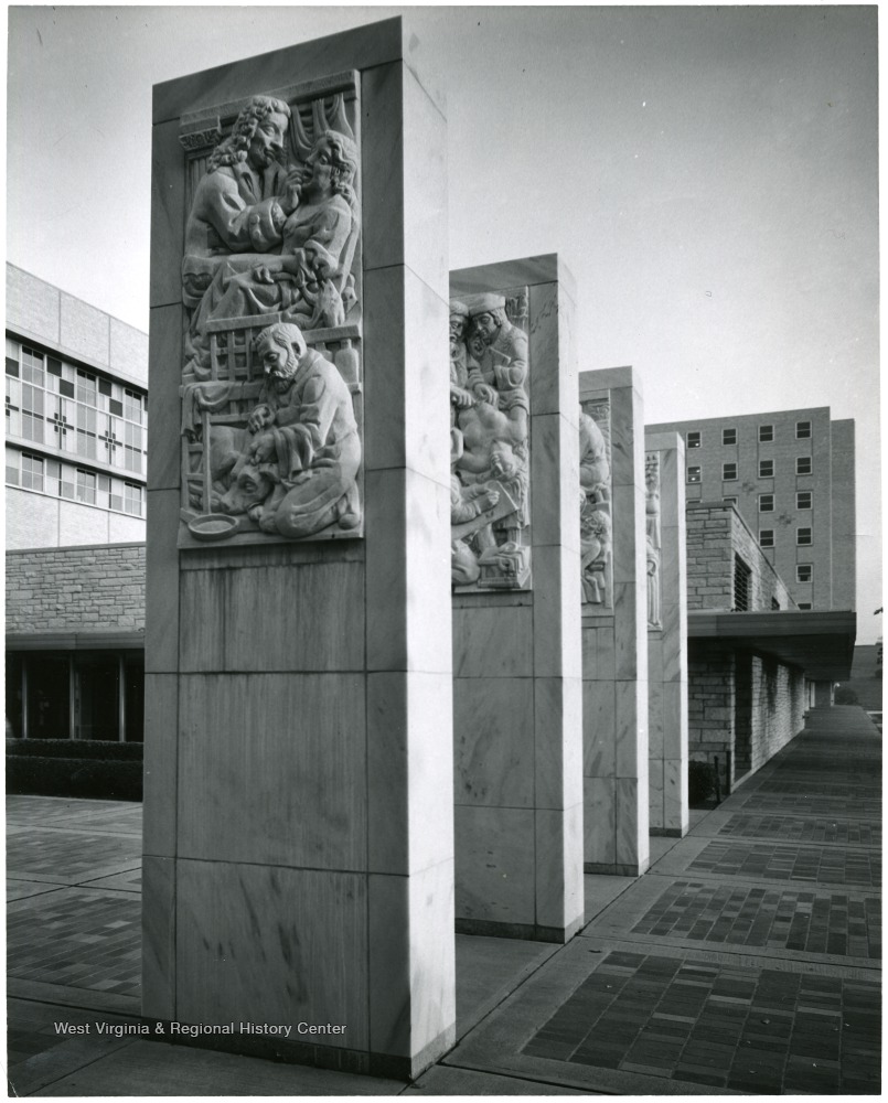 - 'The noted American sculptor Milton Horn was commissioned in 1954 to create a visual history of the healing arts for the proposed West Virginia University Medical Center. He produced eight panels in high relief, each three by seven feet, depicting important developments and personages in the history of medicine, dentistry, nursing and pharmacy. They are carved in white Georgia marble on each face of four 15-foot pylons at the entrance to the Health Sciences Center. For well over a year, the artist worked under a canvas canopy while his wife read from the Bible. People would come and watch and he would discuss politics, religion, or anything else; all the time, chiseling away and becoming quite a celebrity.'