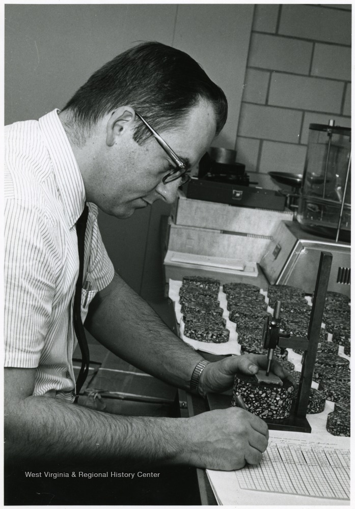 - 'WVU Researcher Byron Ruth tabulates data from samples taken from various roads throughout the state. Checking the compaction of each disk, Ruth receives samples from test roads in Wetzel, Monongalia, Berkeley, and Raleigh counties.'