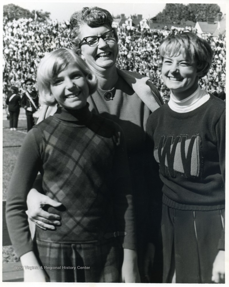 - Mother standing behind two daughters, one is a cheerleader, at Mountaineer Field.