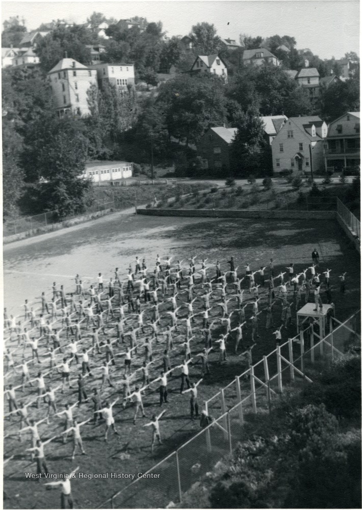 - Cadets exercise in a field below Chitwood Hall. During World War II military training at WVU was under the Army Specialized Training Program.
