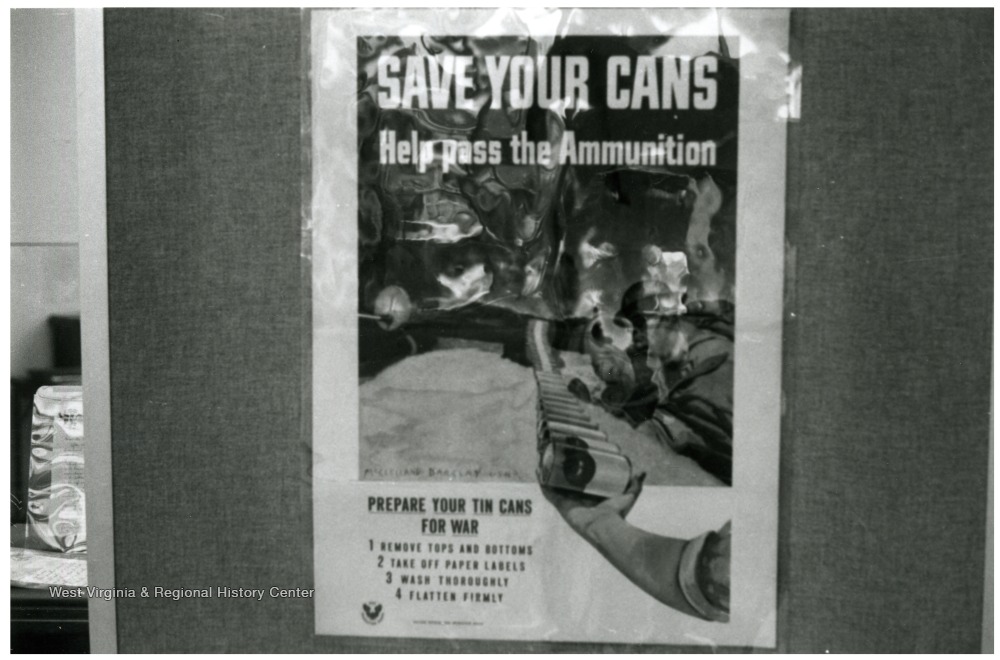 - Exhibit in second floor gallery of Mountainlair. Poster says, 'Save your cans, help pass the ammunition. Prepare your tin cans for war, 1) remove tops and bottoms, 2) take off paper labels, 3)wash thoroughly, 4) flatten firmly.'