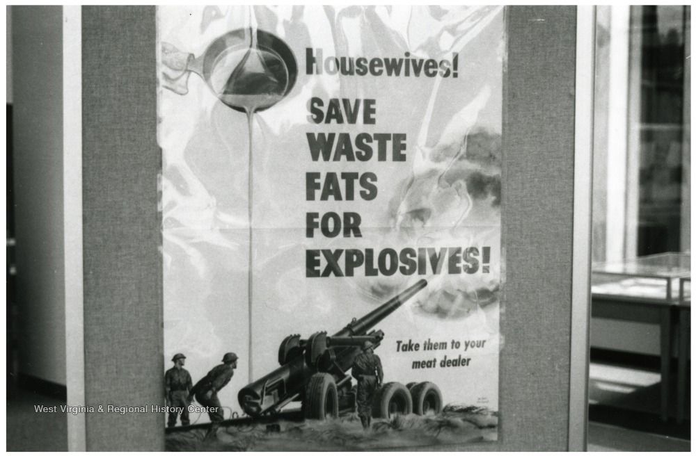 - Exhibit in second floor gallery of Mountainlair. Poster says, 'Housewives save waste fats for explosives, take them to your meat dealer.'