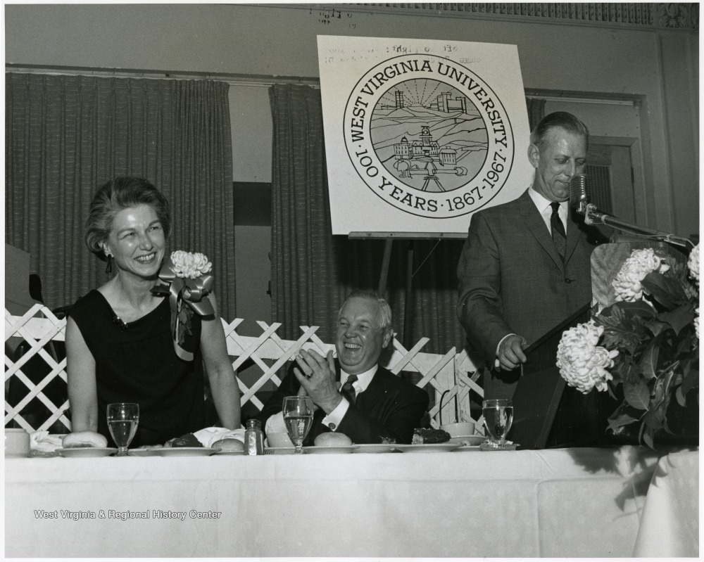 - At the WVU's 100th Anniversary Birthday dinner, from left to right: Mrs. Thomas White, Governor Smith, and Mr. Thomas White are seated at the head table.