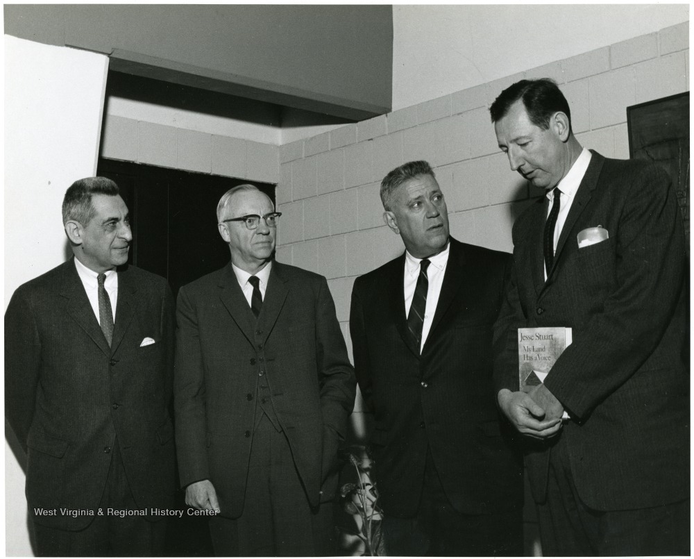 - 'Famed Kentucky author Jesse Stuart (second from right) chats with WVU professors John Caruso, prof. of history and chairman of the symposium planning committee (left); J.P. Brawner, prof. of English (second from left); and Ruel Foster, prof. and chairman of English (right) at the Feb. 22-24, 1967 'Lessons of History,' symposium.'