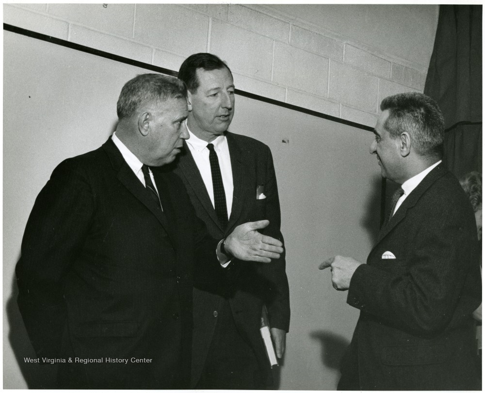 - 'Famous Kentucky writer Jesse Stuart (left) chats with WVU prof. Ruel Foster (Center) and planning committee chairman John Caruso (right) at 'Lessons of History' symposium Feb. 23, 1967.'