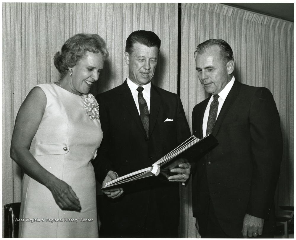 Harry B. Heflin, Acting President and His Wife Look Over Scrapbook Presented to them by Harold J. Shamberger, Assistant to the President, West Virginia University