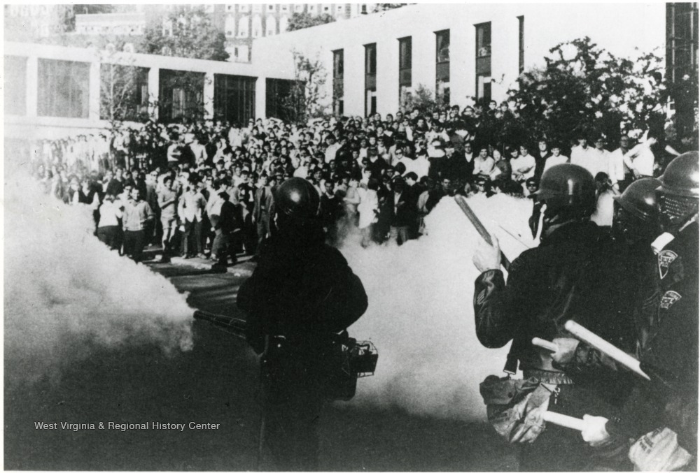 - National Guard Uses Tear Gas during a Demonstration in front of the Mountainlair, West Virginia University