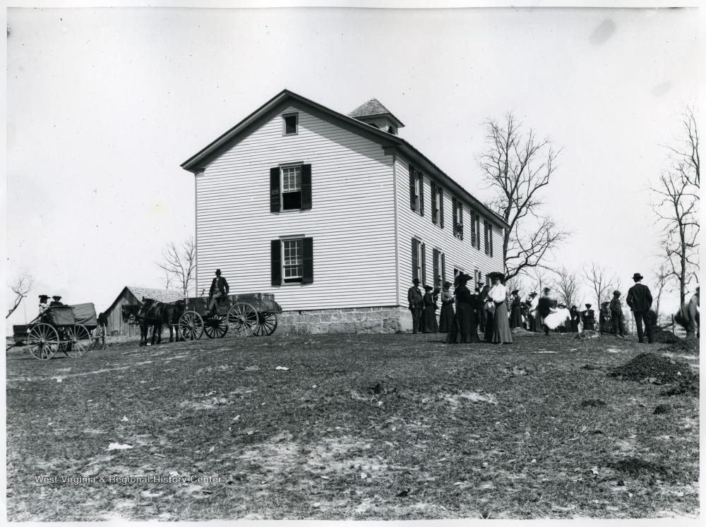- There are many people on the school ground; there are also a horse drawn buggies and a carriage. This is possibly a school house in Sinks Grove in Monroe County.