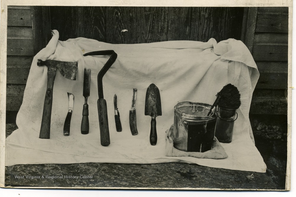 - 'Tools used for treating collar blight. Jar contains bi-chloride, pail, paint. The tool next to trowel is a farrieis. The tool between knife and gauge is a home-made scraper.'