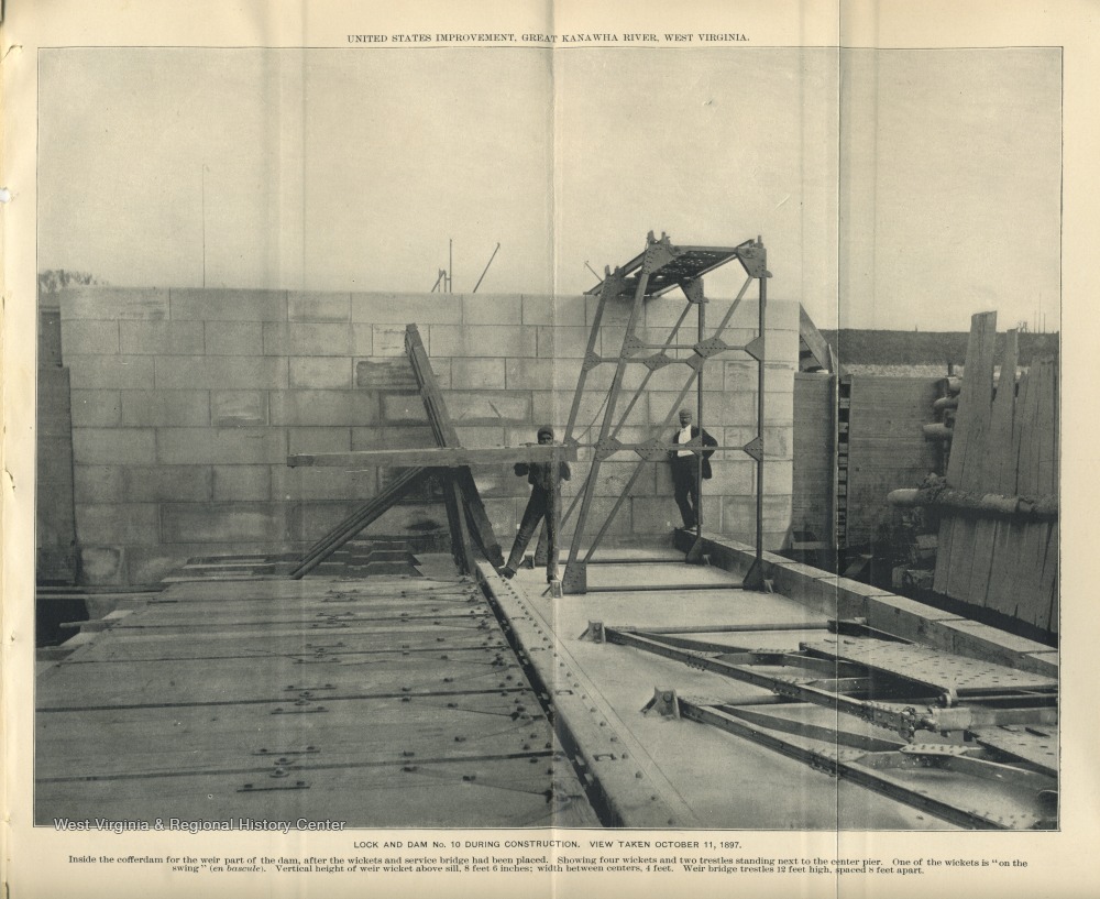 - 'U.S. Improvement, Great Kanawha River, West Virginia. Inside the cofferdam for the weir part of the dam, after the wickets and service bridge had been placed. Showing four wickets and two trestles standing next to the center pier. One of the wickets is 'on the swing' (en bascule). Vertical height of weir wicket above sill, 8 feet 6 inches; width between centers, 4 feet. Weir bridge trestles 12 feet high, spaced 8 feet apart.'