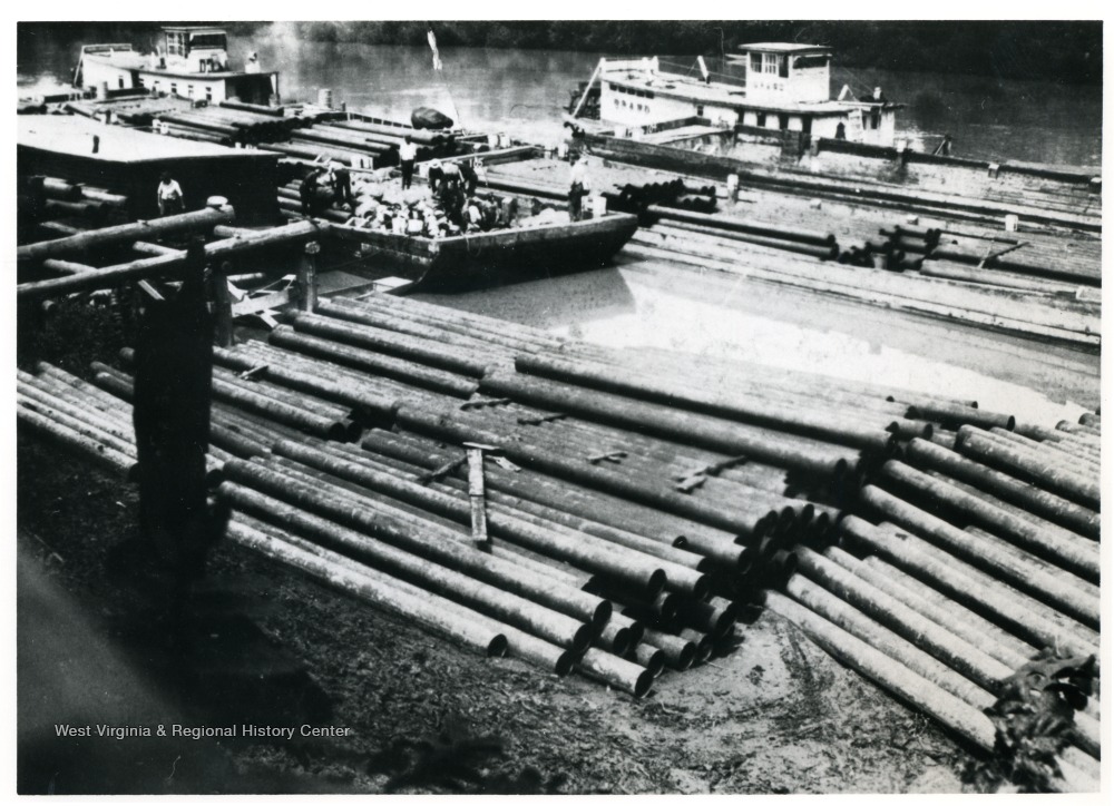 - River Boats and Pipes Stacked on the Shore of the Little Kanawha River