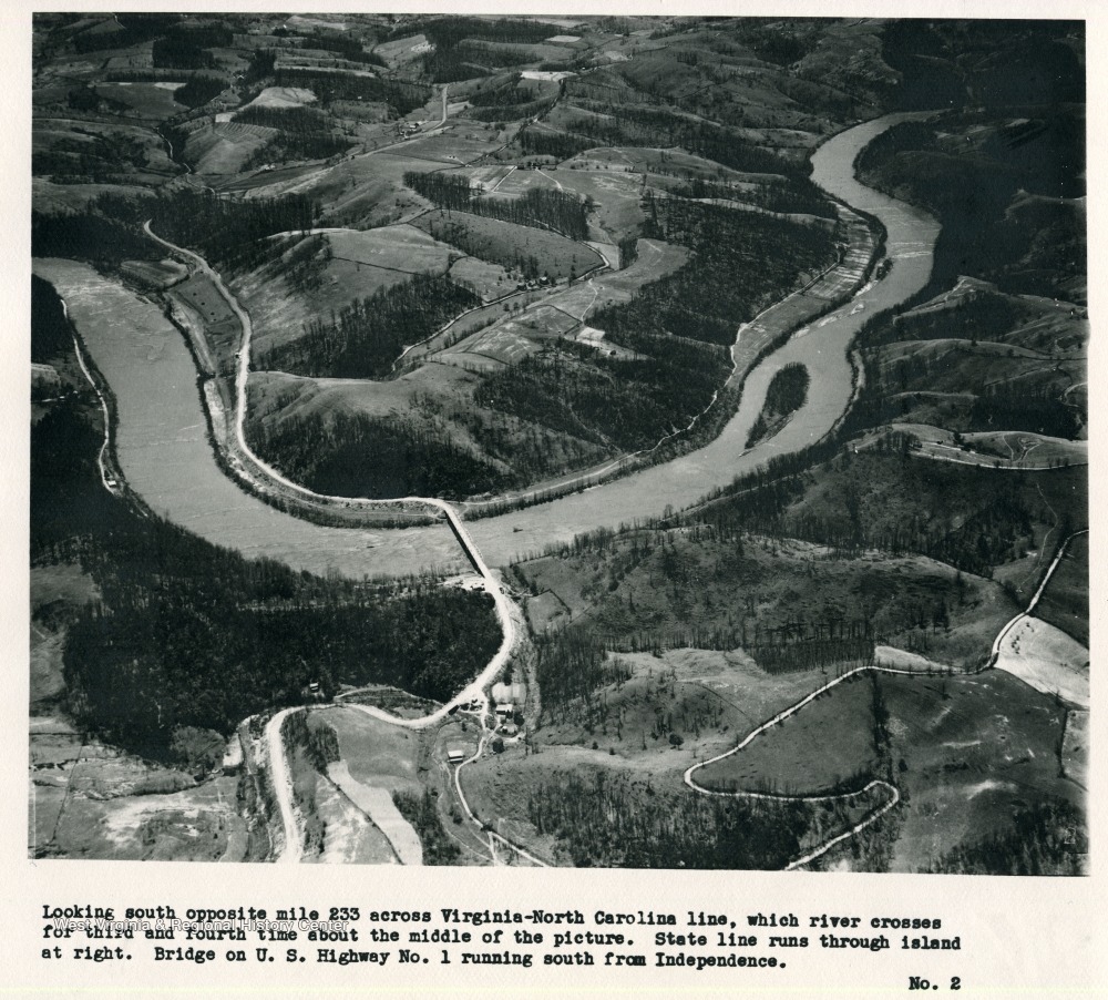 - 'Looking south opposite mile 233 across Virginia-North Carolina line, which river crosses for third and fourth time about the middle of the picture. State line runs through island at right. Bridge on U.S. Highway No. 1 running south from Independence.'