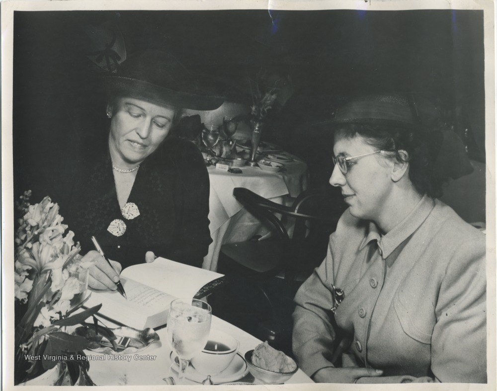 - 'Mrs. Robert Hunter, Jr. of Chester, N.Y. recently received the one hundred millionth book distributed by the Book-of-the Month Club after 23 years of selling newly published books by mail. Mrs. Hunter, mother of three children, lives on a dairy farm which her husband owns and operates. Thinking that the feat of circulating so many books called for a celebration, the Book-of-the-Month Club invited Mrs. Hunter to New York City for lunch with Pearl Buck, famous Nobel Prize-winning writer, a copy of whose latest novel, "Kinfolk", was the one hundred millionth book. Here Miss Buck autographs a special copy of her book for Mrs. Hunter. Conversation at the luncheon table wasn't all literary, since Miss Buck also lives on a farm and enjoyed comparing notes with Mrs. Hunter. Mrs. Hunter joined the Book-of-the-Month Club in 1939, and has received more than 130 books from it.'