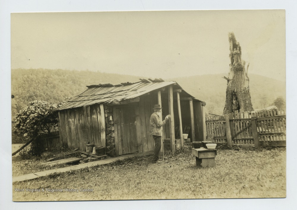 - 'The spring which was to the back of Nancy Hanks home. Note crock on top of spring. Mr. Joseph Doll drinking.' Coyd Yost Photographer. Keyser, W.Va.