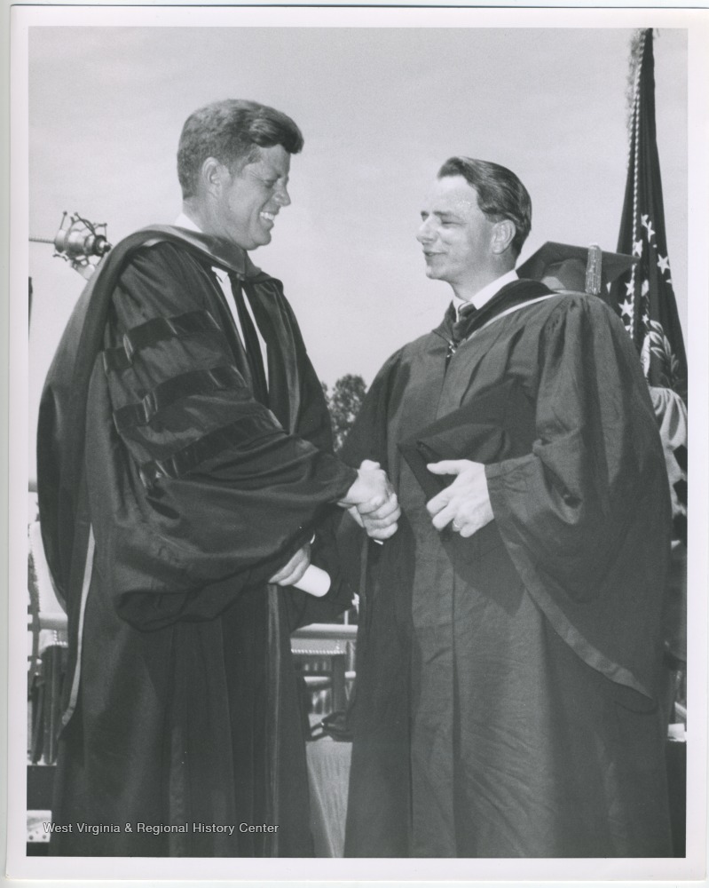 - Senator Robert C. Byrd shaking hands with John F. Kennedy at a graduation ceremony. Byrd Papers duplicate. Original at the R. C. Byrd Center for Legislative Studies, Shepherd University.