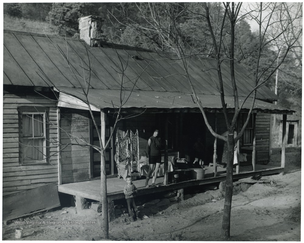 - House has a metal roof; young boy standing next to porch. Laundry hanging and wash tubs on porch.