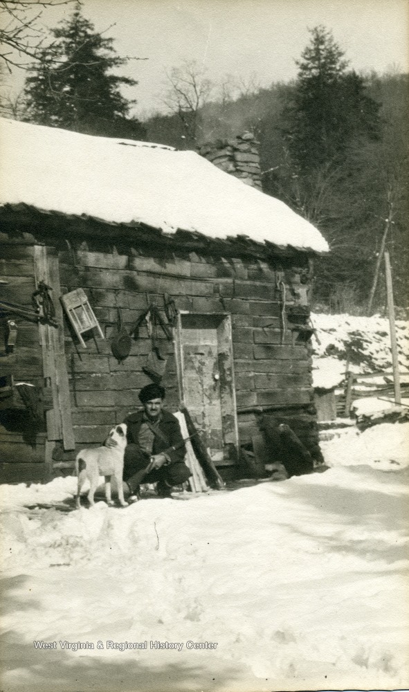 - A photograph of Dana Hicks, holding a hunting rifle, with his dog outside a cabin.
