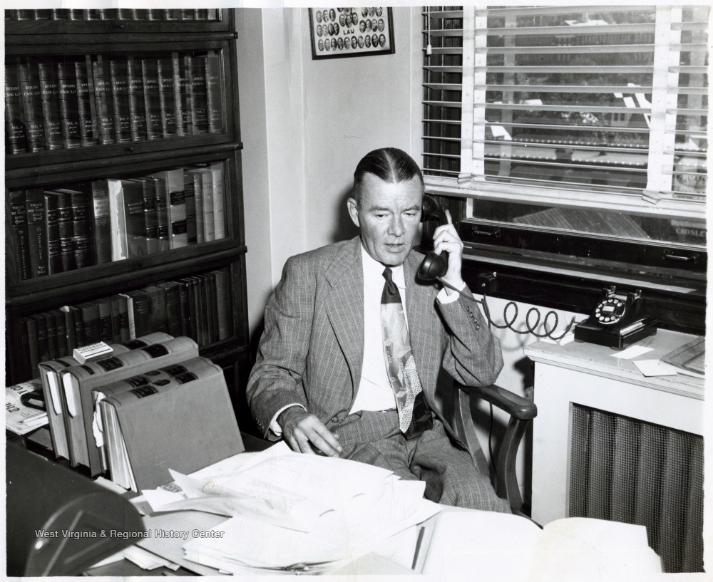 - A photograph of John Sanders seated at his desk and talking on the phone.